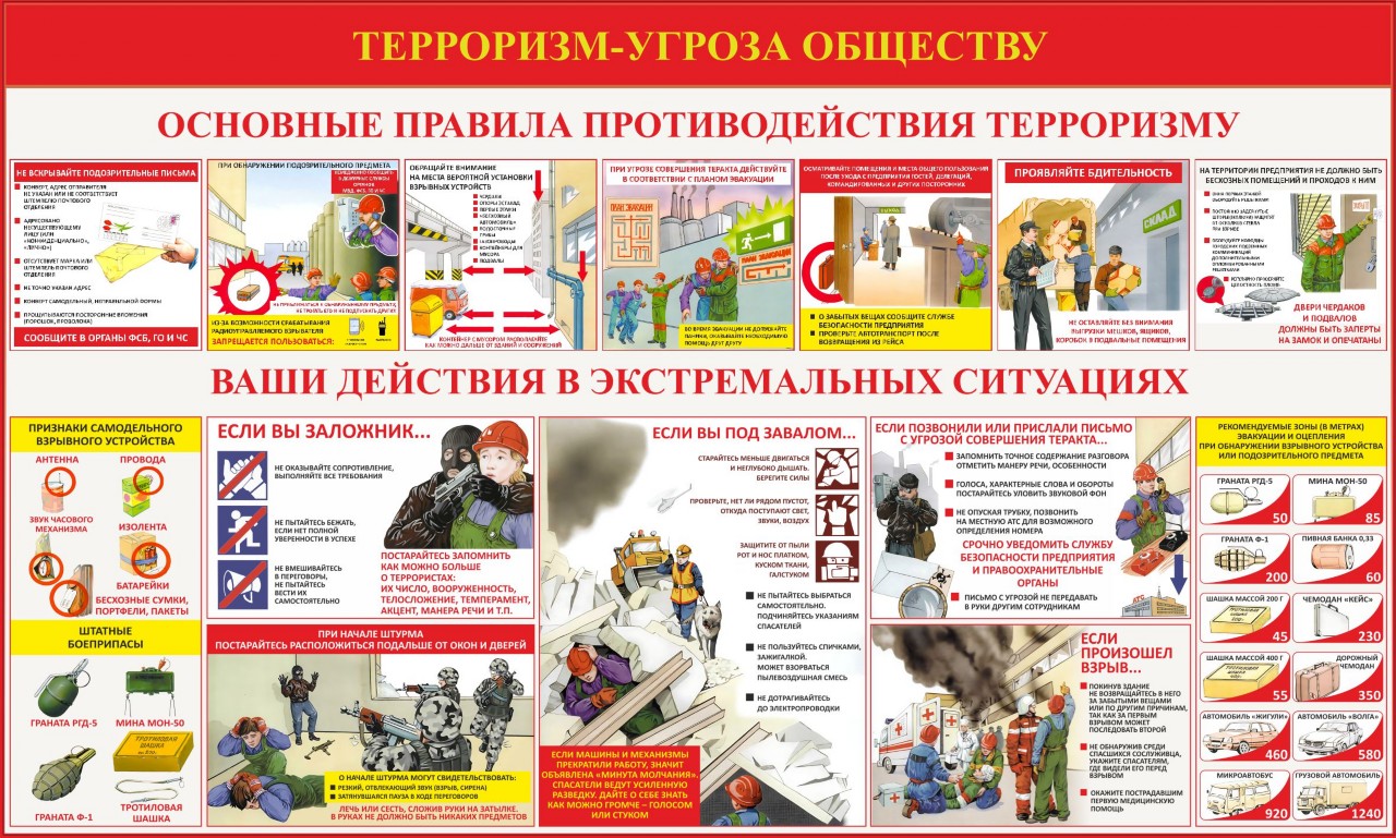 Разработаны инструкции по действиям обучающихся, воспитанников и сотрудников при угрозе и возникновении чрезвычайных ситуаций, связанных с террористическими актами. Проводится инструктаж с сотрудниками по действиям в чрезвычайных ситуациях, связанных с террористическими актам. Систематически проводятся тренировки по отработке практических действий сотрудников при угрозе и возникновении террористических актов.